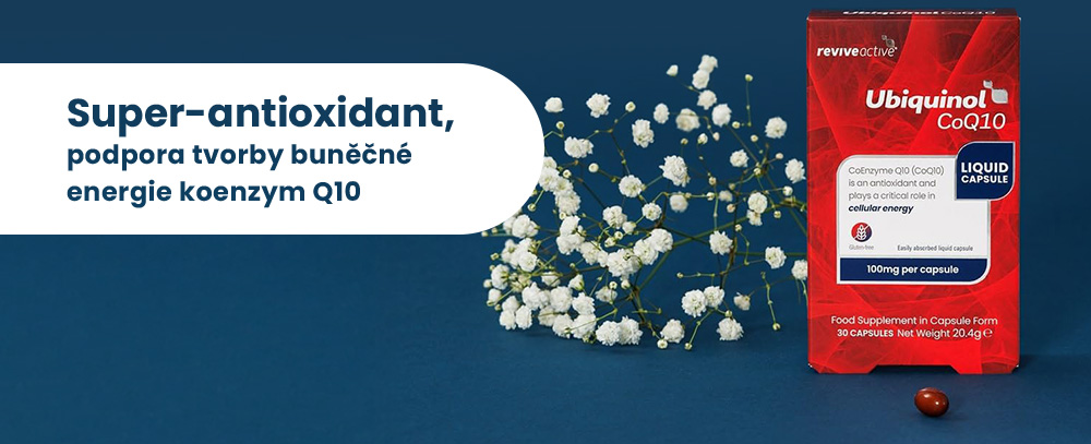 Koenzym Q10 je produkován tělem a má zásadní roli při tvorbě buněčné energie. Jak stárneme, jeho množství přirozeně produkované tělem se zmenšuje. Ubiquinol Q10 nabízí koenzym Q10 ve snadno konzumovatelné formě tekutých kapslí = snadná podpora energetické hladiny pro každý den. Koenzym Q10 je jednou z klíčových složek našeho doplňku Revive Active, jde o zásadní látku rozpustnou v tuku, která je přítomná v každé buňce, ve zvýšeném množství v srdci, játrech a ledvinách. Koenzym Q10 se chová jako antioxidant - omezuje činnost volných radikálů.