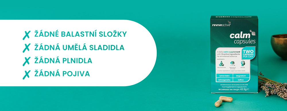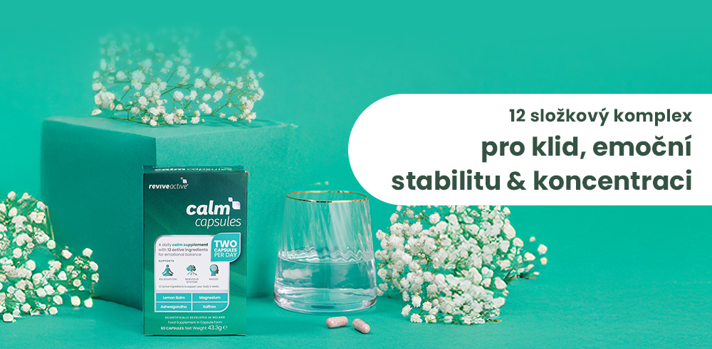 Calm je ve své kategorii ultimátní doplněk stravy, který má okamžitý i dlouhodobý účinek. Produkt je speciálně sestavený pro vytížené jedince vystavené nadměrnému psychickému stresu, emočně náročnému stresu nebo pro každého, kdo má problémy s koncentrací. Lze jej užívat během dne - zklidňuje, ale neuspává. Je vhodný pro všechny věkové skupiny, lze jej užívat při zaměstnání nebo kdykoli, kdy je třeba dodat pocit klidu, pohody a zesílit koncentraci. Calm obsahuje L-theanin a extrakt z listů meduňky pro okamžitý účinek (během hodiny), extrakt z květů šafránů a extrakt z kořene ashwagandhy pro dlouhodobý účinek. Calm dále obsahuje B komplex s obsahem bioaktivního koenzymu vitamínu B2, kyselina listovou ve formě bioaktivního folátu a hořčík v organické formě bisglycinátu hořečnatého. Vitamíny a hořčík účinkují střednědobě až dlouhodobě. To vše bez obsahu nežádoucích a balastních aditiv v každé kapslí! V případě potřeby optimální podpory spánku je možné Revive Active Calm kombinovat s produktem Revive Active Sleep, který je speciálně sestaven pro optimální relaxaci a spánek.