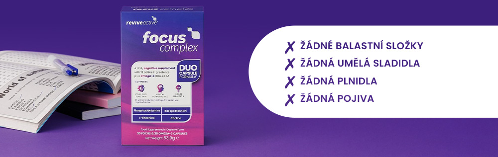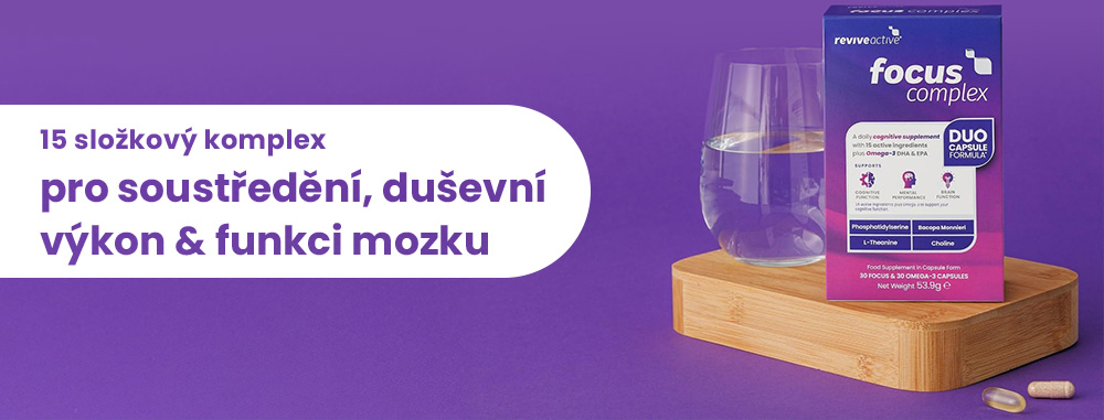 Focus je ve své kategorii ultimátní doplněk stravy, který má okamžitý i dlouhodobý účinek. Produkt je sestavený speciálně pro všechny, kteří potřebují posílit soustředění, ať už při náročném zaměstnání nebo při sportovním výkonu. Podporuje také kognitivní funkce při jejich ústupu - je vhodný i pro seniory. Produkt je ideální užívat ráno se snídaní, ale je speciálně sestavený tak, aby jej šlo užívat i kdykoli během dne - posiluje pocit soustředění, ale nevyvolává nervozitu jako například kofein. Je vhodný pro všechny věkové skupiny, lze jej užívat při zaměstnání nebo kdykoli, kdy je třeba zesílit koncentraci. Focus obsahuje 15složkový komplex ve dvou druzích kapslí - Focus kapsli se složkami L-theanin, L-cholin a Brahmi, které působí velmi rychle. L-theanin snižuje pocit napětí, Brahmi a L-cholin posilují funkci mozku. Extrakt z kůry mořské borovice (Pinus pinaster) má vlastnosti související s oxidativním stresem. Focus dále obsahuje kyselinu listovou ve formě bioaktivního folátu, vitamíny B5, B6, B12, C, D3, E, jód, měď a zinek. Druhá kapsle obsahuje rybí olej (zdroj omega-3 DHA a EPA). To vše bez obsahu nežádoucích a balastních aditiv! V případě potřeby silnější podpory při stresu je možné Revive Active Focus kombinovat s produktem Revive Active Calm, který je speciálně sestaven pro zklidnění při současném zachování soustředění.